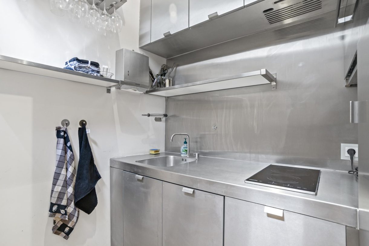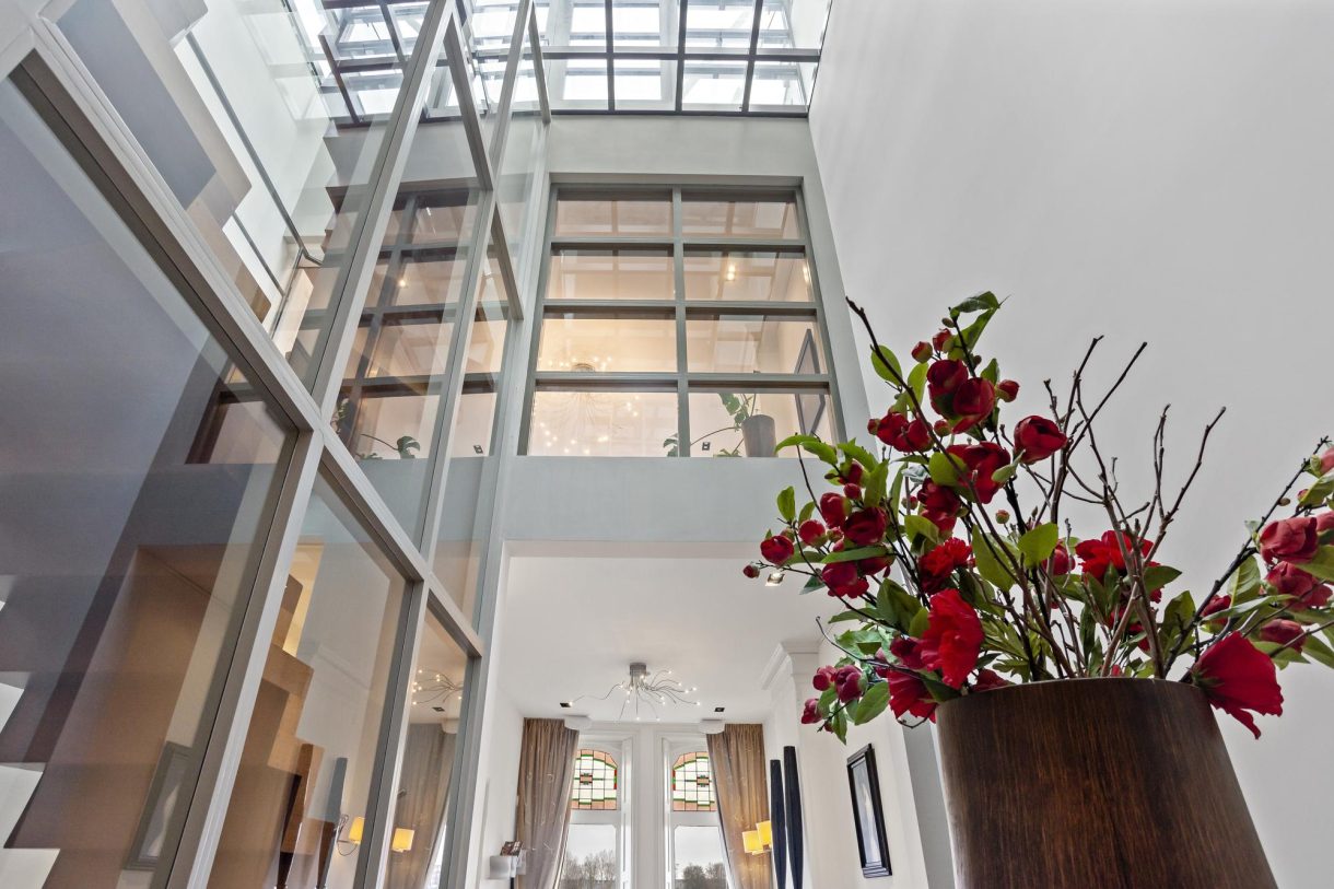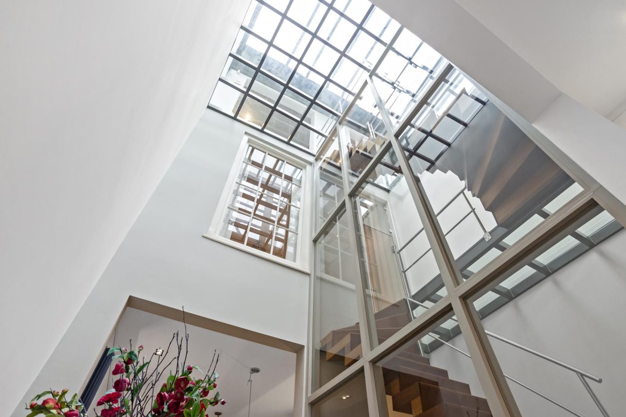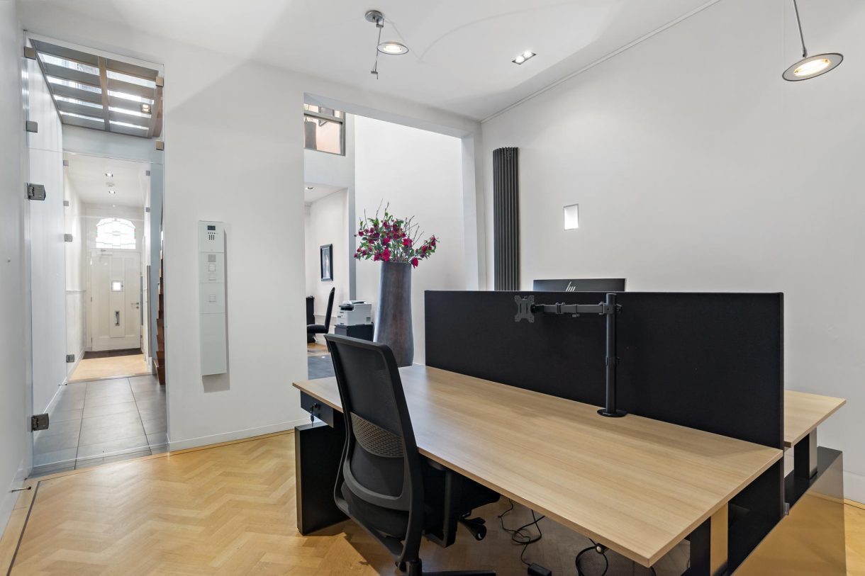 Entree met marmeren vloeren en wanden, garderobe, voormalige receptie ca. 4.31×3.92 en geschikt voor 2 werkplekken, rvs kastenwand, apart toilet en kitchenette met luxe “Miele” inbouwapparatuur, voorts gecreëerd atrium ca. 3.35×2.41 hetwelk compleet is doorgebroken tot de topetage met een schitterende lichtinval, verder op de begane grond een ontvangstruimte ca. 5.16×3.09 voorzien van lcd scherm en zwart natuurstenen schouw met gashaard. De begane grond is voorzien van visgraat parket, natuurstenen plavuizen met ledverlichting, design radiatoren en armaturen en sfeervolle wand- en plafondverlichting.