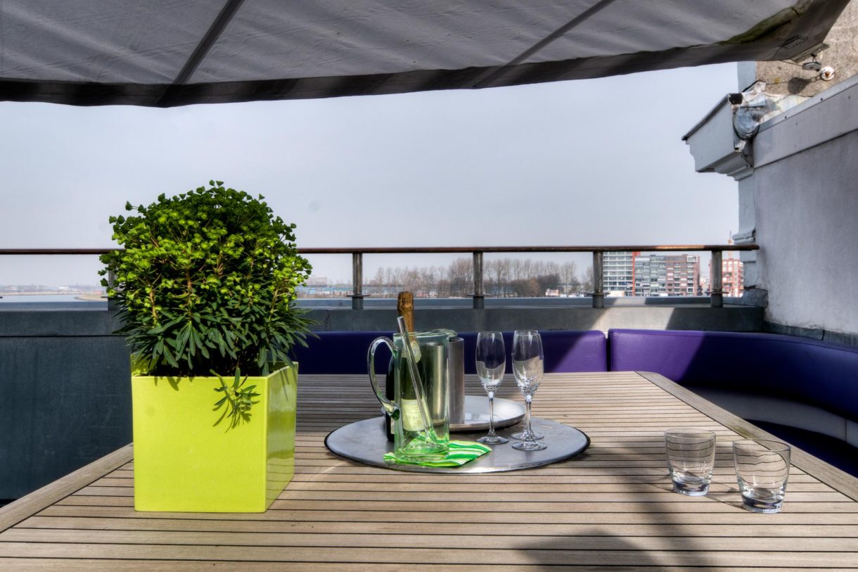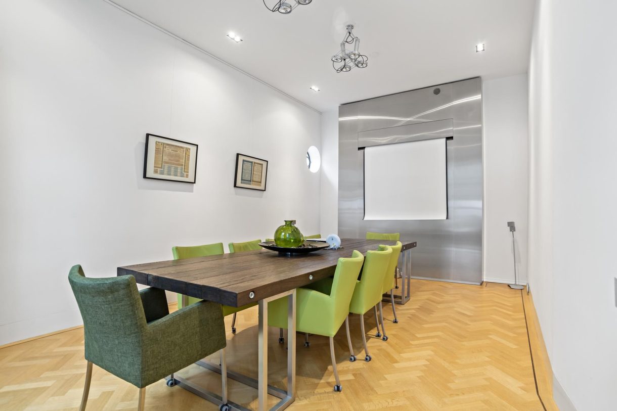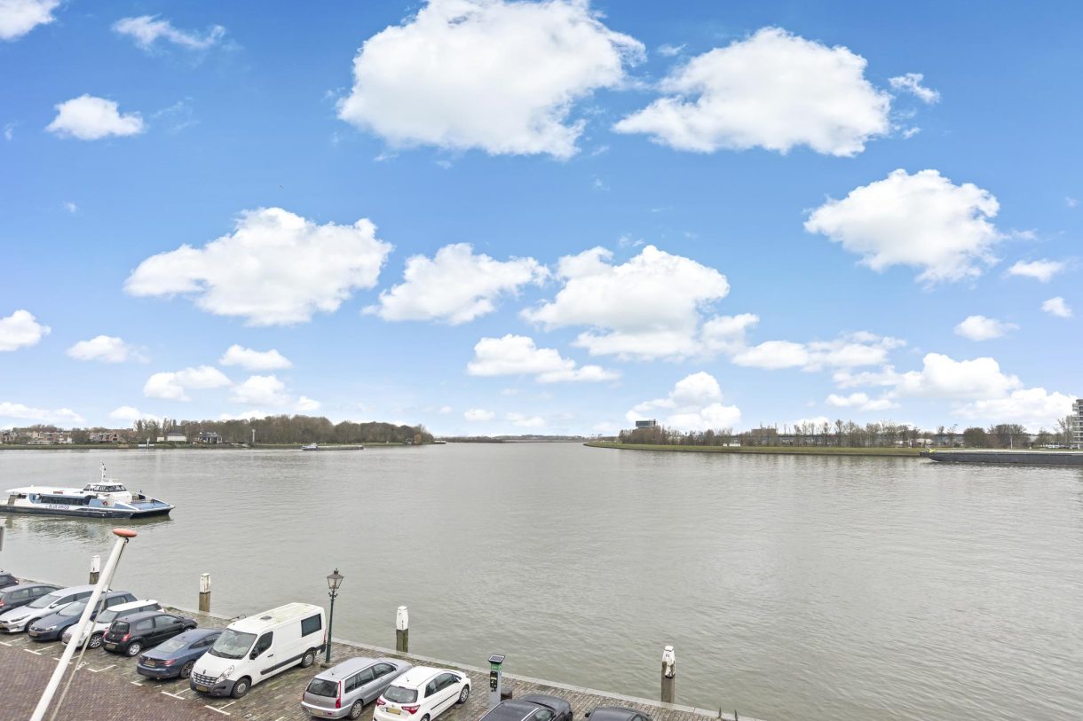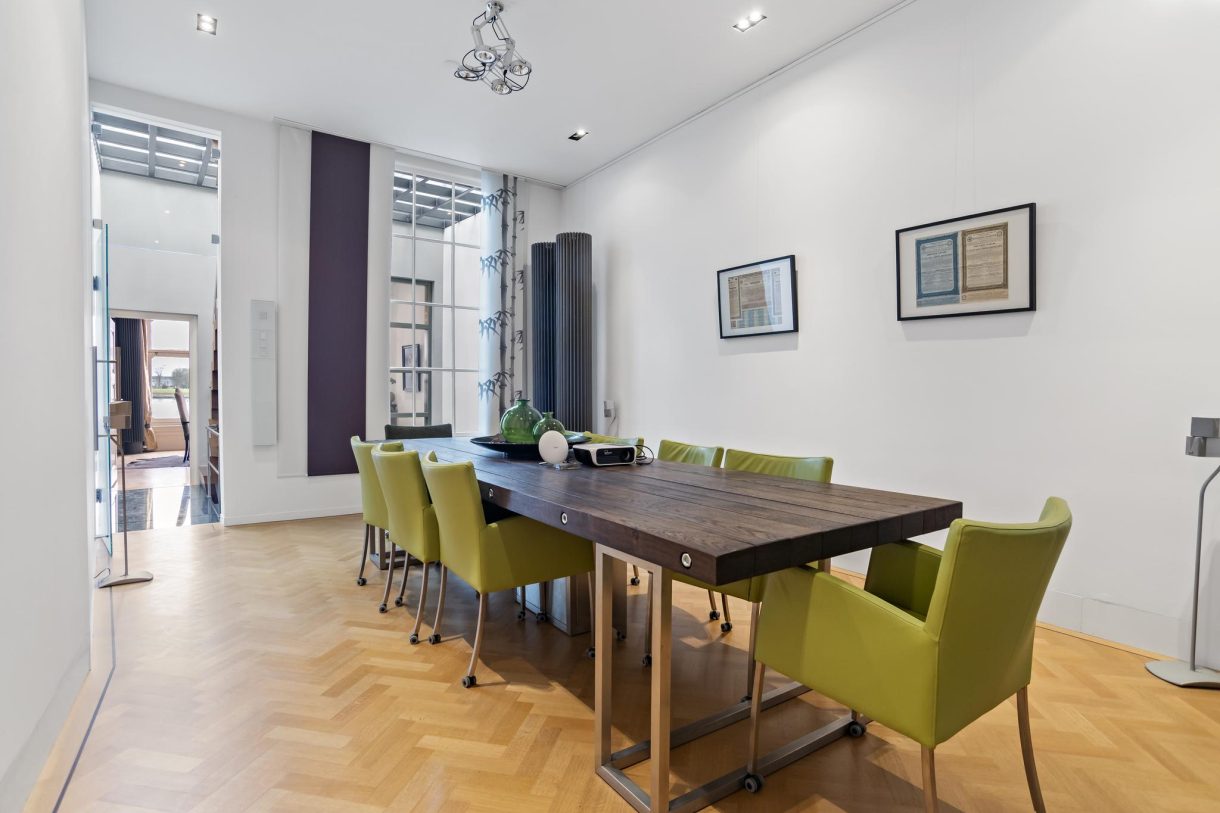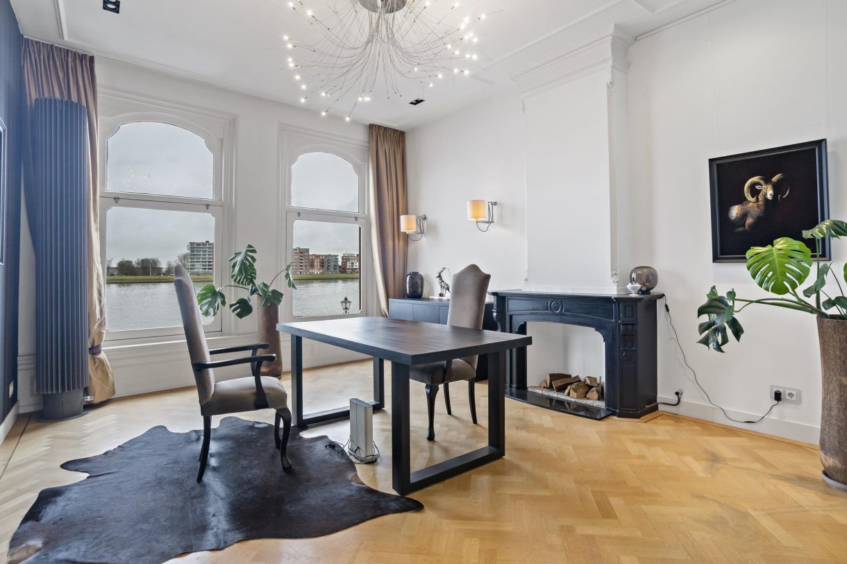 Voorts zwevende houten trap naar de 1e etage, imposante vergaderruimte aan de achterzijde ca. 6.63×3.94 voorzien van robuuste vergadertafel, rvs wand en aan de voorzijde bevindt zich de directiekamer ca. 5.33×4.29 met weids uitzicht over de rivier en eveneens voorzien van zwart natuurstenen schouw, ornamenten plafonds en lcd scherm. Ook deze verdieping bestaat uit een perfecte combinatie tussen klassieke en moderne architectuur wat terugkomt in de visgraat parketvloer, de glazen vloer en design radiatoren en armaturen.