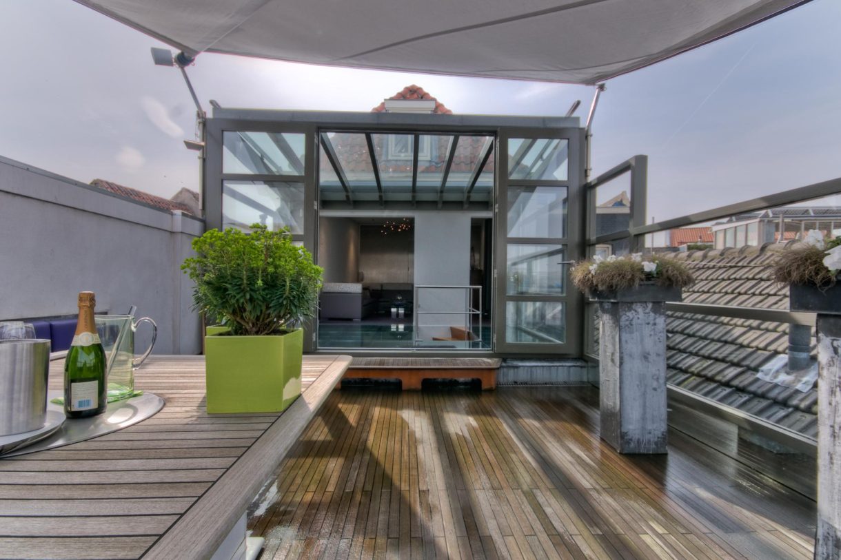 De gehele 2e etage is ingericht als loungeruimte ca. 8.08×4.35 met als eyecatcher een glazen vloer boven het atrium en glazen uitbouw met panoramisch uitzicht over het drie rivierenpunt, vanuit de lounge grote openslaande deuren spectaculair dakterras ca. 5.69×434 met vrij uitzicht. Tot slot op deze etage een stijlvolle badkamer met inloopdouche en toilet en een trap naar slaapkamer in de kapetage.