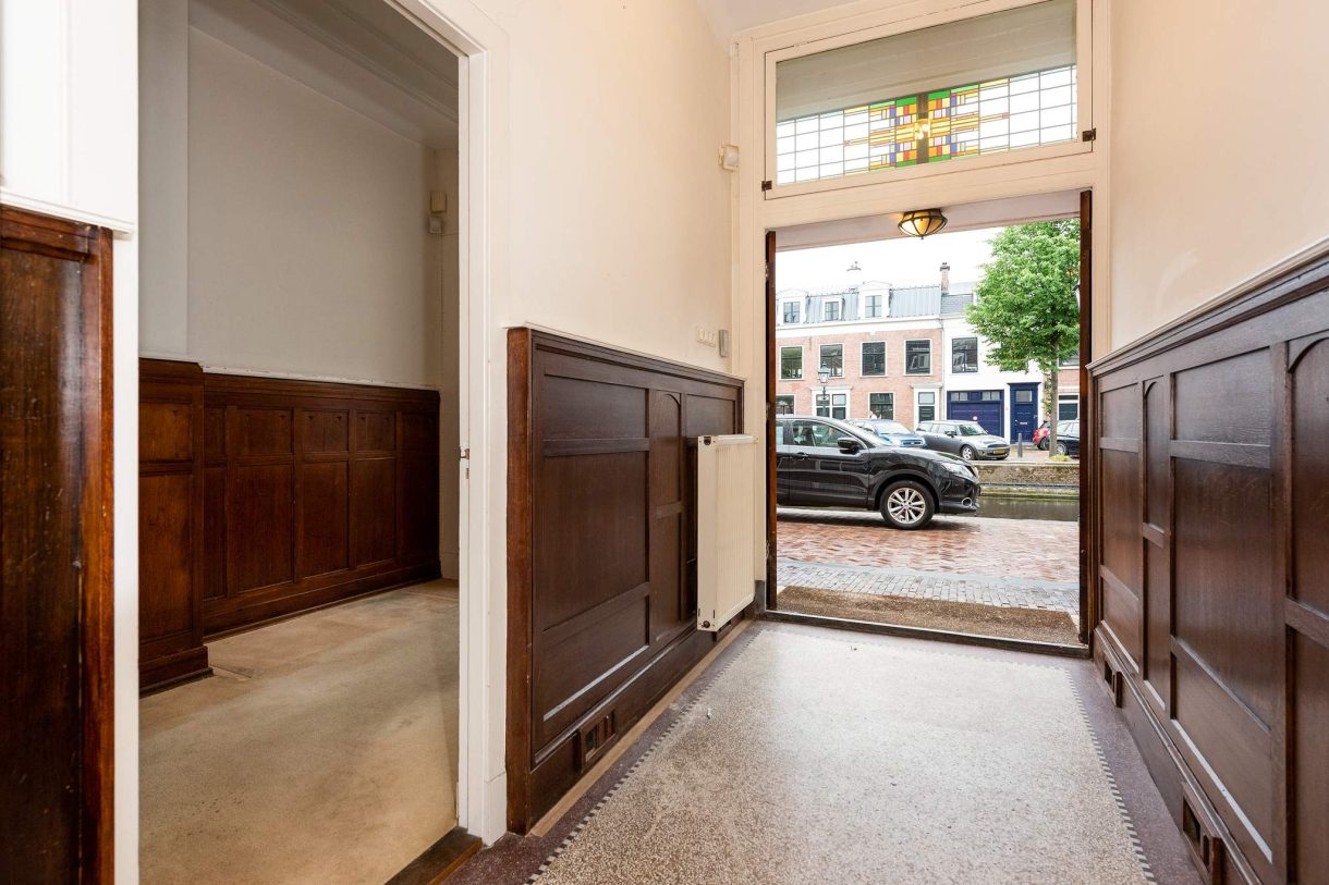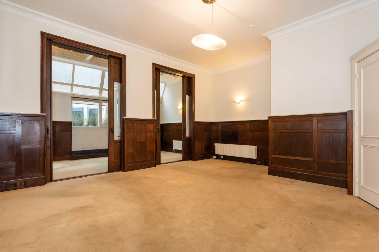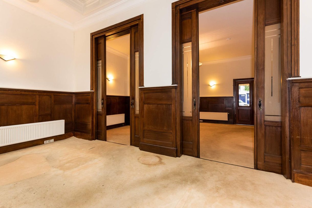 Entree ruime vestibule ca. 3.39×1.85 met originele houten lambriseringen en fraaie granito vloer, voorkamer ca. 3.90×2.40 eveneens met houten lambriseringen, glas in lood bovenlicht en meterkast, grote centrale kantoorruimte ca. 6.37×5.36 met een prachtige hoogte van 3.40 meter, houten lambriseringen rondom, toegang tot modern toilet met voorportaal, plavuizen vloer, facet geslepen tegelwerk en wandcloset, toegang tot pantry met rvs aanrecht, koelkast en onderkast.