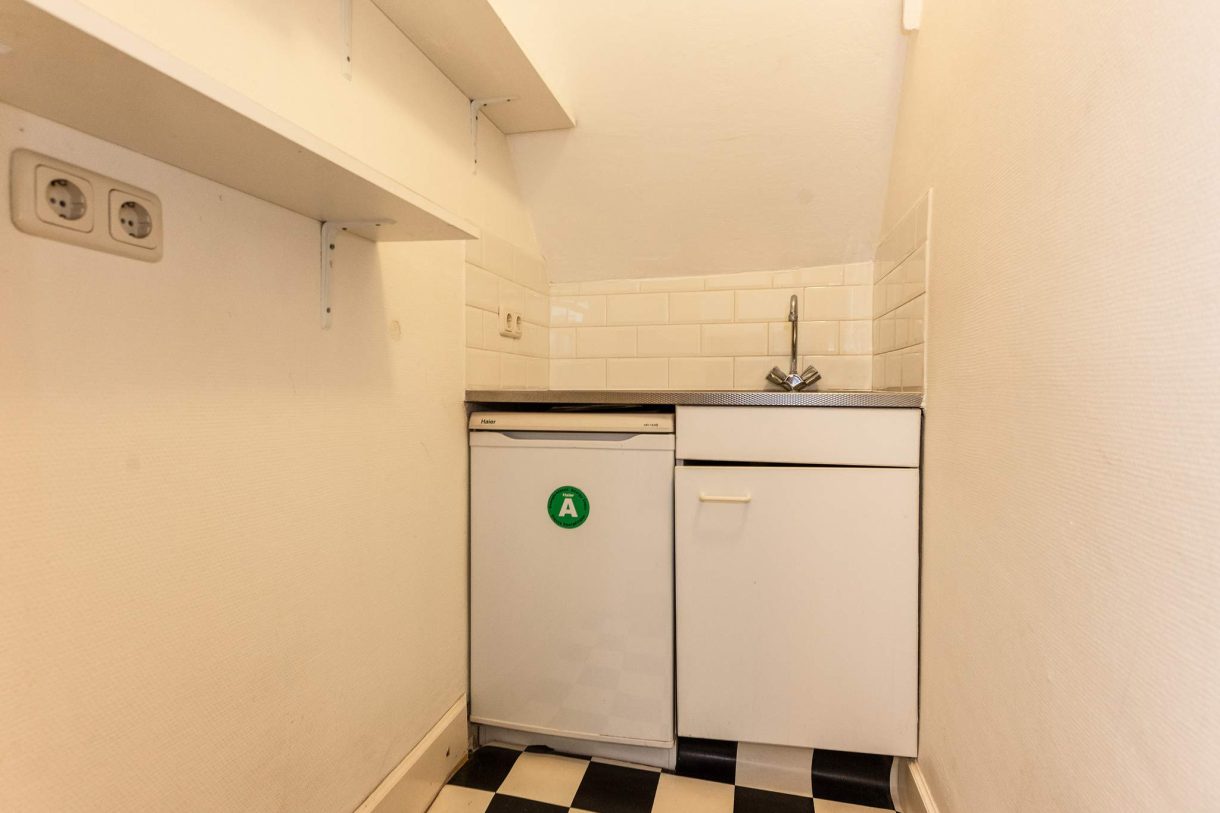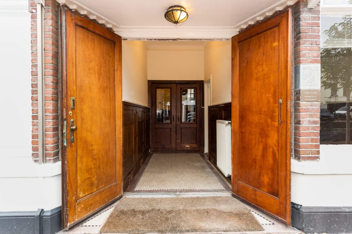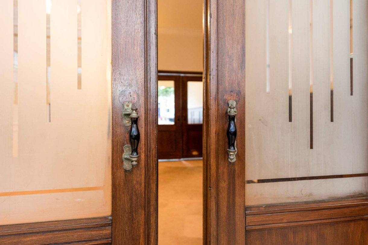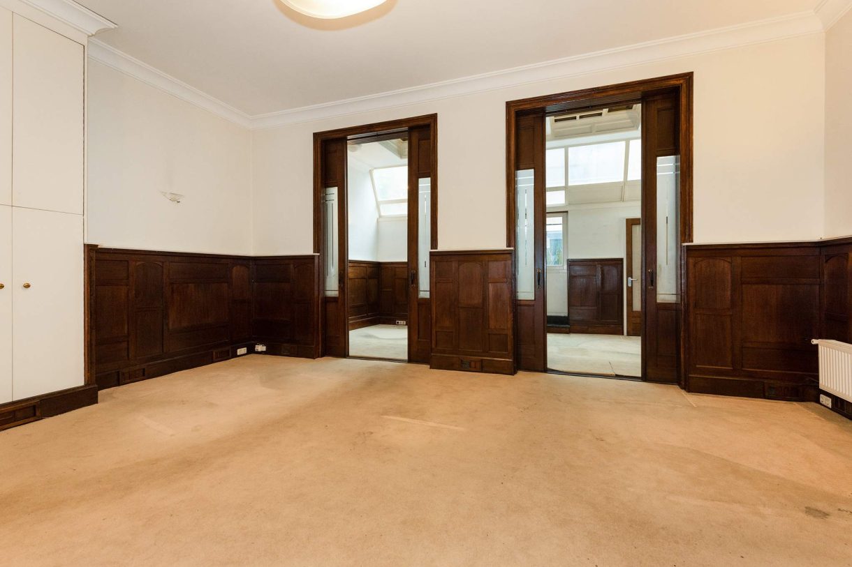 Entree ruime vestibule ca. 3.39×1.85 met originele houten lambriseringen en fraaie granito vloer, voorkamer ca. 3.90×2.40 eveneens met houten lambriseringen, glas in lood bovenlicht en meterkast, grote centrale kantoorruimte ca. 6.37×5.36 met een prachtige hoogte van 3.40 meter, houten lambriseringen rondom, toegang tot modern toilet met voorportaal, plavuizen vloer, facet geslepen tegelwerk en wandcloset, toegang tot pantry met rvs aanrecht, koelkast en onderkast.