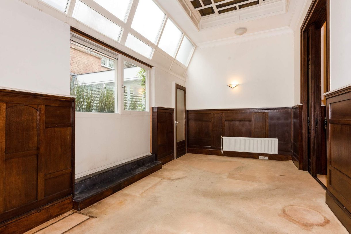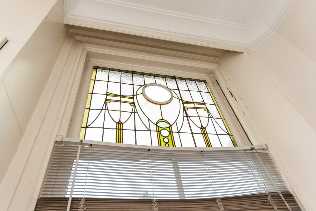 Voorts tweemaal schuifdeuren met geslepen glas naar ruime lichte serre ca. 6.06×3.08 met glas in lood paneel in het plafond,