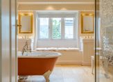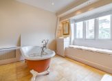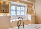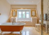 Vanuit de overloop de trap naar de tweede etage, overloop met kasten, daklicht en technische ruimte voor de cv-ketel en wasmachine droger combinatie. Slaapkamer aan de voorzijde met twee vaste kasten. Tot slot de luxe badkamer die is voorzien van fraai tegelwerk, vrijstaand ligbad op pootjes, maatwerk zitje, 2 wastafels, toilet en douche.