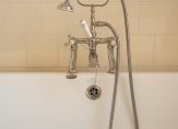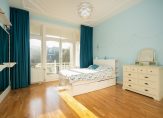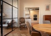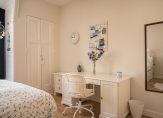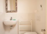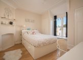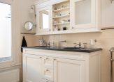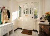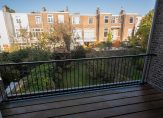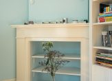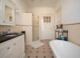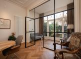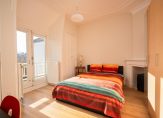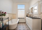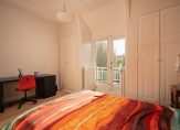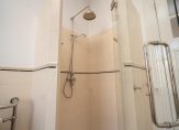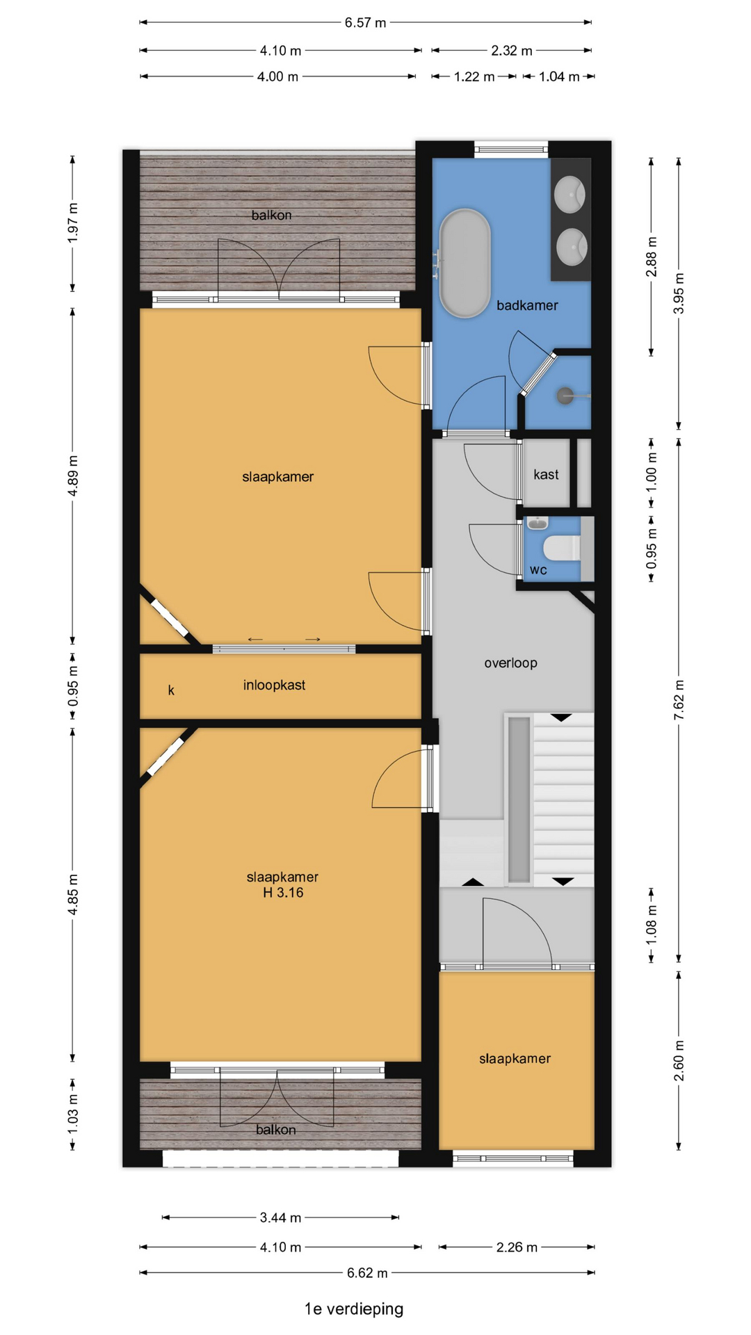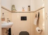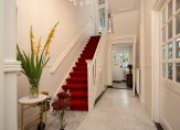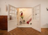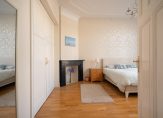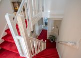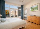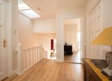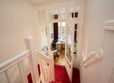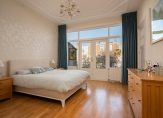 De trap naar het tussengelegen bordes met toegang naar de voorkamer gaat dan weer 5 treden omhoog naar de overloop op de 1e etage, voorkamer met schouw en dubbele openslaande deuren naar inpandig voorbalkon, achterkamer met inloopkast, klassieke schouw en dubbele openslaande deuren naar achterterras, luxe ruime badkamer met bad op pootjes, wastafelmeubel en douche, apart toilet en een vaste kast.