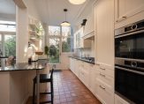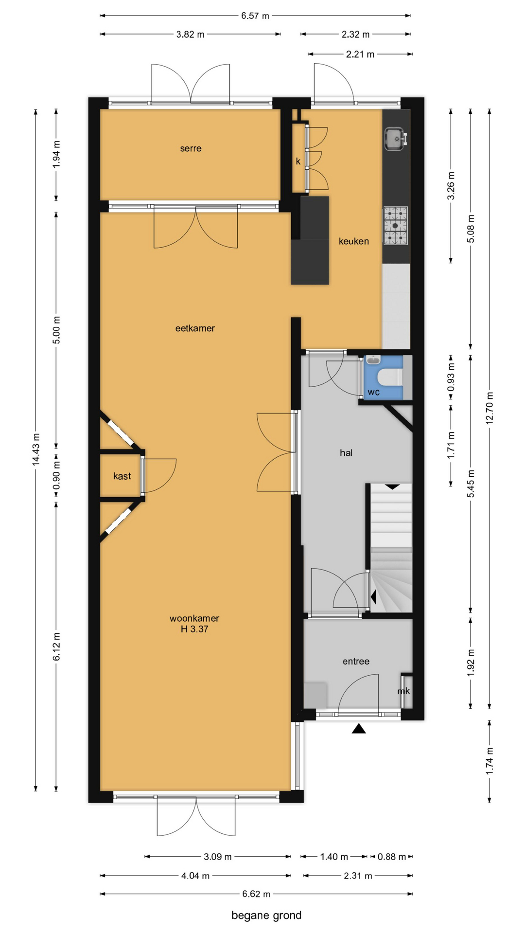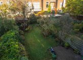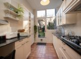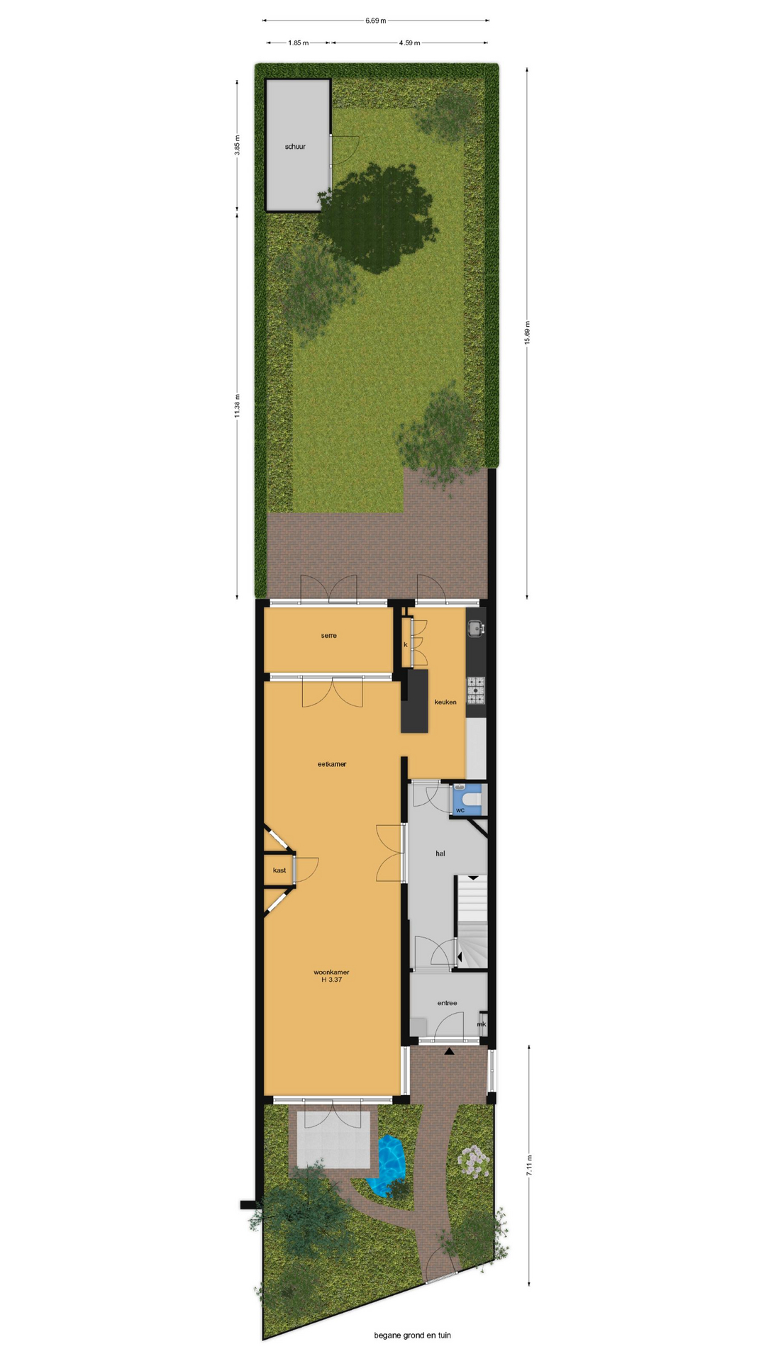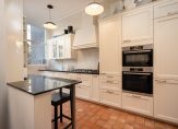 Voortuin met overkapte entree, vestibule met tochtdeur en wit marmeren vloerplaten doorlopend in de gang met trappenhuis, toilet met fonteintje, trap naar kelder ca. 4.5×2.2 met dubbel lichtraam, kamers en suite ca. 14.6×4.1 met diepe servieskast, 2 mooie klassieke schouwen met open haard, origineel plafondlijstwerk, visgraat parketvloer, serre en dubbele openslaande deuren aan voor- en achterzijde. Moderne keuken met veel kastruimte en inbouwapparatuur. De mooie diepe achtertuin heeft een terras en een houten tuinhuis/schuur.