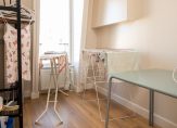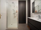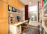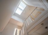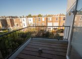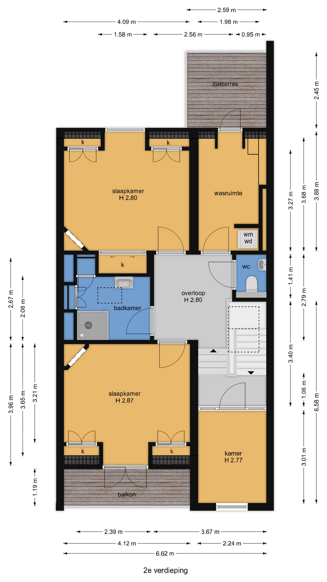De doorlopende bordestrap gaat naar de 2e etage met aan het bordes een voorkamer, weer 5 treden omhoog naar de overloop met lichtkoepel, voorkamer ca. 4.2×3.2 met schouw, vaste kasten en dubbele openslaande deuren naar voorbalkon, tussengelegen badkamer met lichtkoepel, kastruimte, wastafelmeubel en douche, achterkamer met vaste kasten, ruime waskamer met toegang tot een terras.