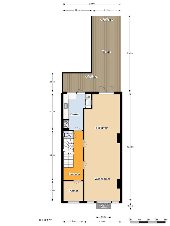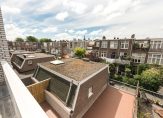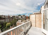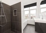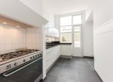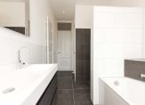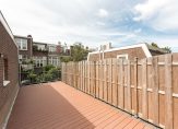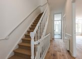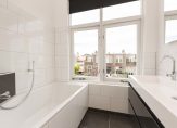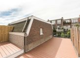 Trap naar de 1e verdieping, gang, luxe toilet met fonteintje, ruime woonkamer ca. 12.40×4.10 met aan de voorzijde een balkonnetje met uitzicht op “de Fred”, aan de achterzijde openslaande deuren naar het ruime terras van ca. 35 m², luxe en zeer ruime keuken ca. 4.12×2.21/3.21 met veel werkruimte en voorzien van alle apparatuur, voorzijkamer 2.26×2.21.