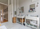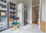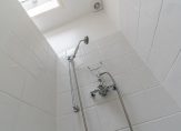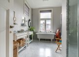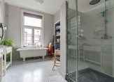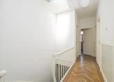 Trap naar 2e etage met lichte overloop met groot daklicht, eveneens toilet in stijl met stortbak, fontein en marmeren vloertegels, stookruimte met CV-combiketel, heerlijk lichte voorkamer ca. 5.13×4.35 met ornamenten plafond, marmeren schouw en vaste kast, voorzijkamer ca. 2.85×2034 met vaste kast en dakkapel, grote tussengelegen 2e badkamer ca. 3.45×1.97 met inloopdouche met glazen deur, handdoekradiator, vaste wastafel op zuil met planchet en spiegel, marmeren vloertegels, inbouwverlichting, mechanische ventilatie, opstelplaats wasmachine en droger, en te openen daklicht ten behoeve van de natuurlijke ventilatie, grote achterkamer, ca. 4.56×4.35 met ornamenten plafond ne vaste kast, achterzijkamer ca. 4.19×3.14 met ornamenten plafond en extra zijraam voor de lichtinval.