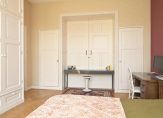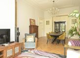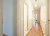 Brede trapopgang naar 1e etage, overloop met origineel plafond, toilet eveneens in stijl met stortbak, fontein en marmeren vloer, diepe vaste kast, 2e kamers en suite ca.11.91×4.31 met suiteseparatie met schuifdeuren en 4 vaste kasten, ornamenten plafonds, zwart marmeren schouw met gas open haard in beide kamers, openslaande deuren naar zowel voor- als achterbalkon en kledingkast in stijl met paneeldeuren, voorzijkamer ca. 2.95×2.31 met origineel plafond, moderne ruime badkamer in stijl ca. 4.24×3.12 met ligbad op pootjes, inloopdouche met glazen deur, 2 vaste wastafels met meubel, planchet en spiegel, marmeren vloertegels en origineel plafond.