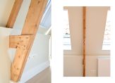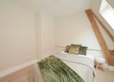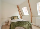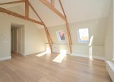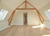 Gezamenlijke entree van het gebouw, trap naar 2e etage, entree appartement, slaapkamer, hal, een badkamer die net als de keuken naar eigen wens kan worden geplaatst. Aan de achterzijde de riante woonkamer met nokhoogte van ca. 3,74 meter en kapconstructie in het zicht.