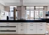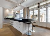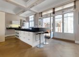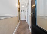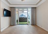 Through the front garden with luxury bluestone floor tiling and borde staircase, you reach the front door of the flat. The staircase gives access to the ground floor but, if desired, the basement can also be accessed via an external staircase. The entrance to the flat is half a floor above street level. The bright hallway (with panelling) gives access to the guest toilet, the bedrooms and the living room. The luxurious toilet is exceptionally spacious and equipped with a free-hanging toilet, illuminated mirror and vanity unit. The beautiful double doors with cut glass windows give access to the living room. This very spacious living room (broken rooms ensuite) with a generous seating area and dining table has beautiful ornamental ceilings. These ceilings are constructed in such a way ( free-hanging on springs) that noise and movement from the floor above can hardly be experienced. The beautiful fireplace with original mantelpiece, the herringbone floor, radiator casings, the natural stone window sills, everything is coordinated in a particularly tasteful manner. The luxurious extended open kitchen is located at the rear of the full-width house. This luxury kitchen is more than fully equipped and is a true paradise for real cooking enthusiasts. The white kitchen with thickened hardstone top is equipped with a cooking island with seating area, Quooker, 5 separate gas burners by Gaggenau (divided into 2-1-2), large swivelling extractor fan, built-in coffee machine, combi oven and combi microwave, wine fridge. fridge-freezer and a dishwasher. The door at the rear gives access to the terrace. Here you find the 2nd kitchen, a real outdoor kitchen in the beautiful canopy. This canopy includes a patio heater, Boretti cooker with hob and grill and a pizza oven. Of course, it does not lack a sink with hot and cold water. A lovely place to prepare beautiful dishes all year round. To the left and right of the terrace are beautiful electric skylights of the basement.