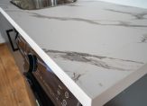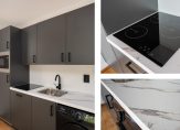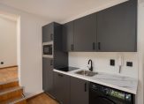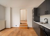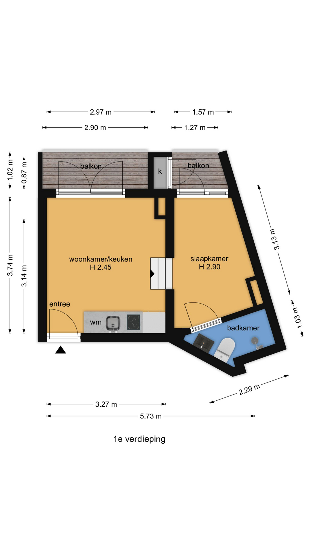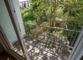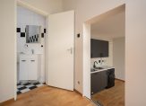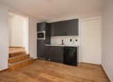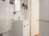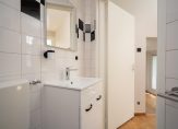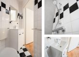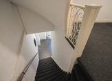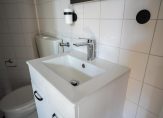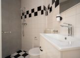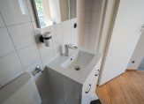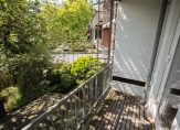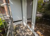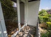 Entree van het complex, trap naar de eerste etage, entree appartement, woonkamer met nieuwe open keuken en deur naar achterbalkon op het zonnige zuidwesten, de slaapkamer is eveneens rustig gelegen aan de achterzijde en beschikt over nog een balkon met balkonkast en badkamer voorzien van inloopdouche, toilet en wastafel.