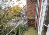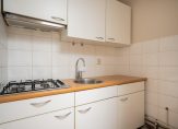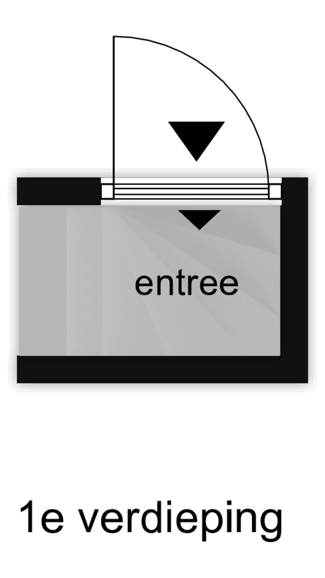 Entree van het complex, trap naar de eerste etage, entree appartement, woonkamer met open keuken en deur naar achterbalkon op het zonnige zuidwesten, de slaapkamer is eveneens rustig gelegen aan de achterzijde en beschikt over nog een balkon met balkonkast en badkamer voorzien van inloopdouche, toilet en wastafel.