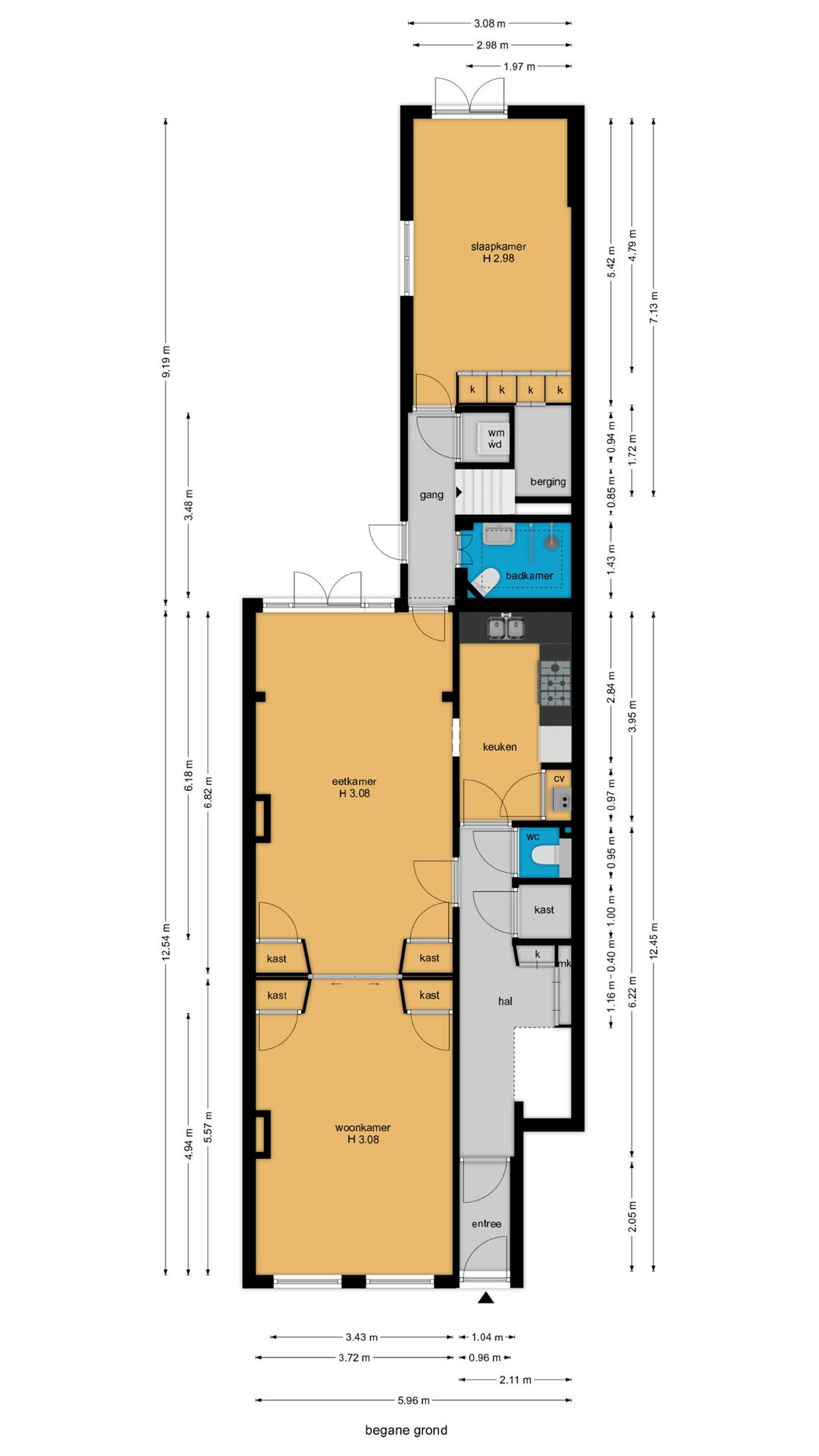 Vanuit de woonkamer leidt een gang naar de uitbouw met op de begane grond een badkamer met inloopdouche, wastafel, toilet en lichtkoepel, een ruime slaapkamer met ingebouwde kastenwand en een extra grote bergkast, openslaande deuren naar de achtertuin, in de gang tevens nog een kast met opstelplaats voor wasmachine en wasdroger.