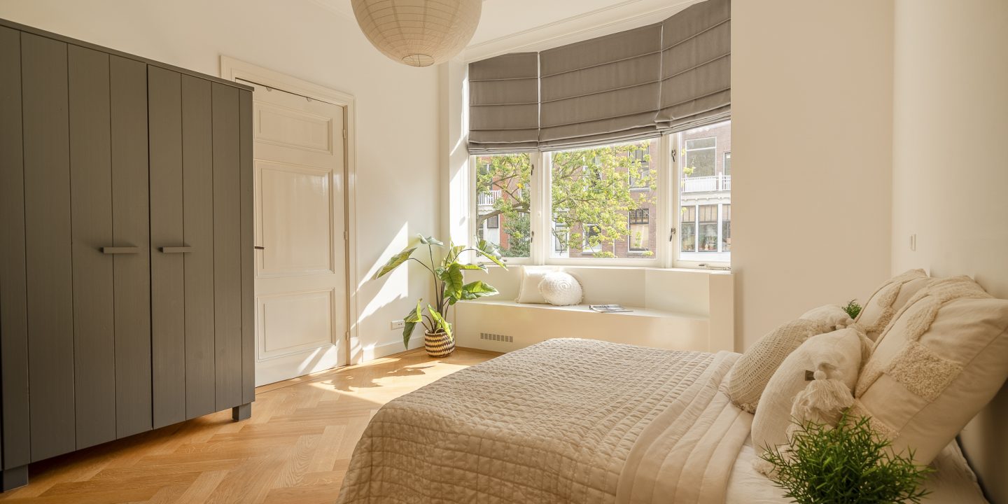 Aan de voorzijde de eerste riante slaapkamer met ornamenten plafond en erker met zitje. De slaapkamer heeft een eigen badkamer voorzien van hoogwaardig tegelwerk, ligbad, natuurlijke daglichttoetreding, meubel met dubbele wastafel en inloopdouche.