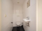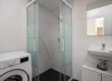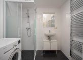 Separate toilet met fonteintje. Tussengelegen moderne badkamer met douche, wastafel, wandcloset, rvs handdoekradiator, opstelplaats voor wasmachine en aparte kast met CV-ketel.