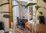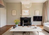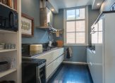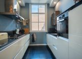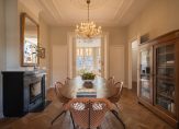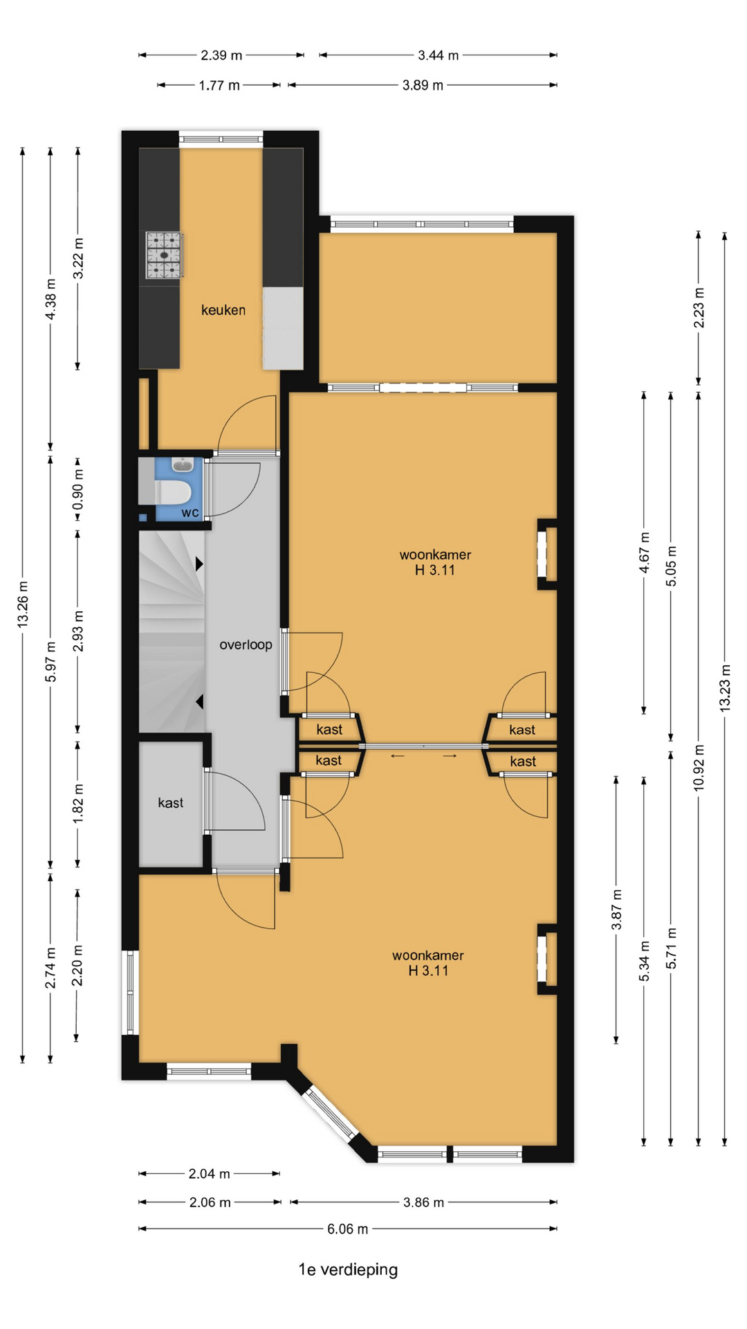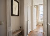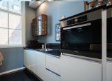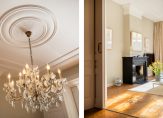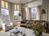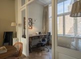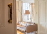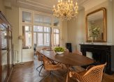 Eigen entree op straatniveau, ruimte voor de trap met meterkast, trap naar de eerste etage, overloop met garderobekast en toilet. Vanuit de overloop de schitterende kamers en suite voorzien van bijgetrokken zijkamer waardoor een zeer gunstige lichtinval is ontstaan. Deze woonkamer beschikt verder over meer dan 3 meter hoge ornamenten plafonds, fraai glas in lood bovenlichten, visgraat parketvloer en suiteseparatie met schuifdeuren en vaste kasten. De moderne keuken is ruim van formaat en voorzien van Miele combioven, 5-pits gaskookplaat, rvs afzuigkap, koel-/vriescombinatie en vaatwasser.