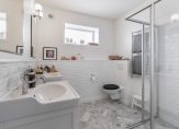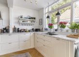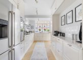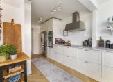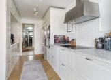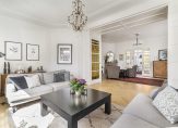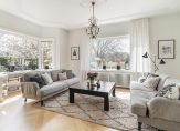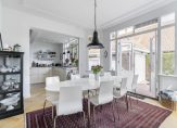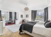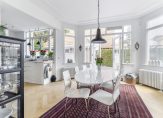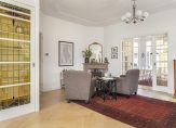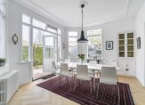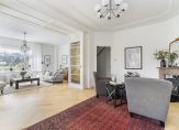 Vanuit de hal de schitterende kamers en suite die een stuk hoger liggen dan het straatniveau waardoor een vrij uitzicht ontstaat en de lichtinval uitstekend is. Deze kamers zijn voorzien van fraaie eiken visgraat parketvloer, vaste kasten met originele glas-lood-in-looddeuren, marmeren schouw met allesbrander, ornamenten plafonds en schuifdeuren naar de woonkamer. Deze slim ingedeelde ruimte is voorzien van ramen rondom, openslaande deuren naar de tuin en biedt ruimte voor een grote eettafel. De keuken is voorzien van hoogwaardig marmeren werkblad aan beide zijden, inductiekookplaat, vaatwasser, combimagnetron en hoog model bakoven. De tuin is sfeervol aangelegd met diverse niveauverschillen, oprit voor twee auto’s, garage met puntdak en fietsenberging.