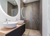 Aan de achterzijde de twee slaapkamers die uitzonderlijk rustig zijn gelegen, de hoofdslaapkamer beschikt over openslaande deuren naar de beschutten achtertuin die gunstig op het zuidoosten is gelegen. De tussengelegen badkamer is voorzien van fraai tegelwerk, inloopdouche met glazen wand en badkamermeubel met dubbele waskom.