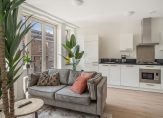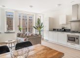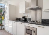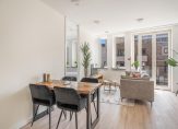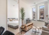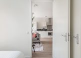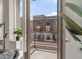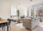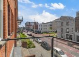 Entree van het complex met trap of lift naar de 1e etage, entree appartement, hal voorzien van toilet met fraai tegelwerk en wandcloset, stijlvolle living met fantastische lichtinval dankzij grote raampartijen, luxe open keuken voorzien van hoogwaardige inbouwapparatuur en ruime inpandige berging met opstelplaats voor de cv-ketel en balansventilatie. Vanuit de woonkamer openslaande deuren naar schitterend vrijhangend balkon met hoogwaardig afgewerkte glazen balustrade gelegen op het zonnige zuidwesten. Aan de voorzijde is een ruime slaapkamer gesitueerd eveneens met gunstige lichtinval dankzij de grote raampartijen.