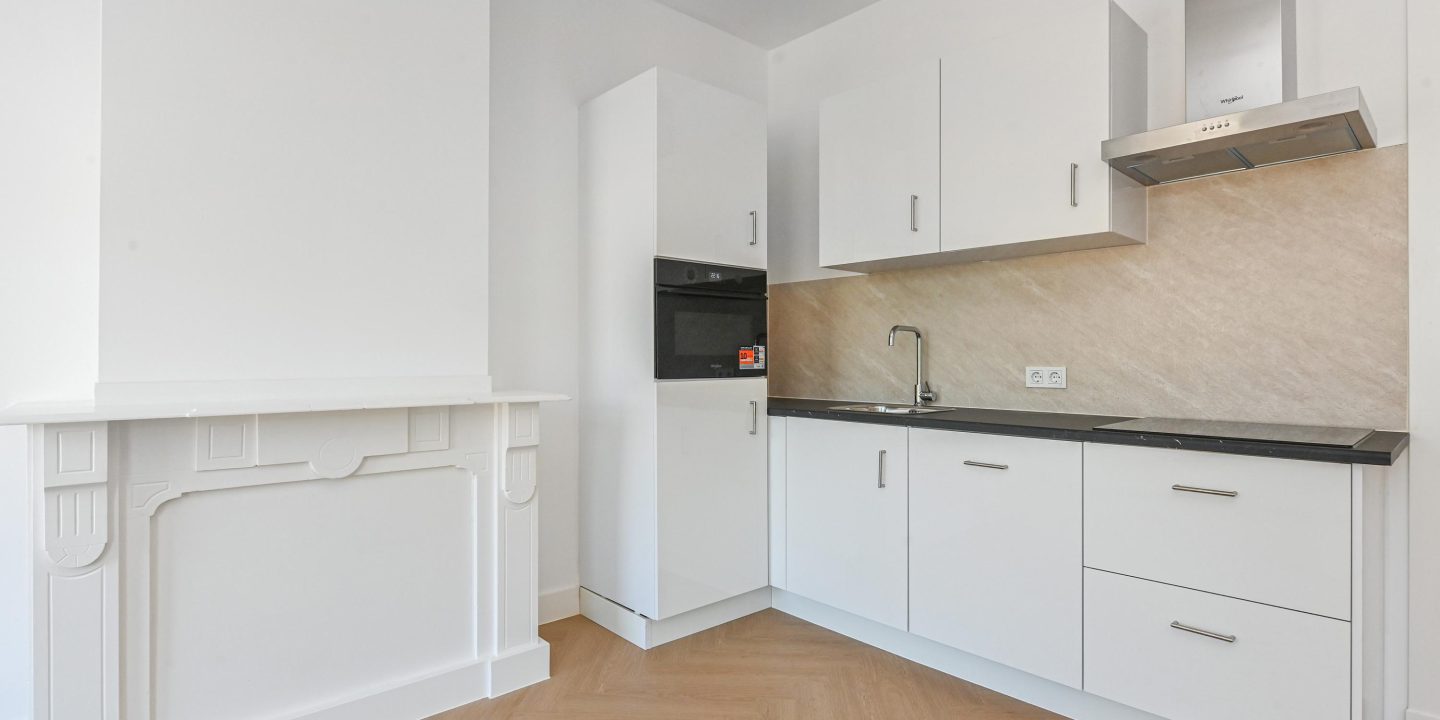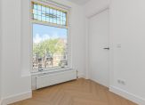 Gezamenlijk entree van het voormalig bovenhuis, trap naar de tweede etage, entree appartement, woonkamer met hoog plafond, visgraat vloer en karakteristieke glas in lood bovenlichten. De nieuwe luxe open keuken is voorzien van inductiekookplaat, koel-/vriescombinatie, whirlpool combioven, afzuigkap en vaatwasser. De slaapkamer is gelegen aan de voorzijde maar toch heel rustig dankzij het aangebrachte dubbel glas. De tussengelegen luxe badkamer is voorzien van fraai tegelwerk, inloopdouche met glazen deur, handdouche en regendouche, badkamermeubel met wastafel, handdoekradiator, spiegel met verlichting, toilet en wasmachineaansluiting.