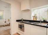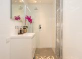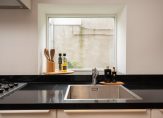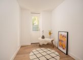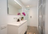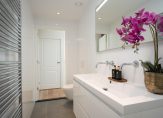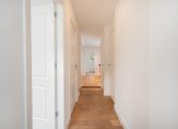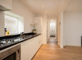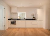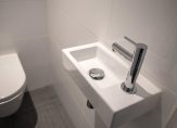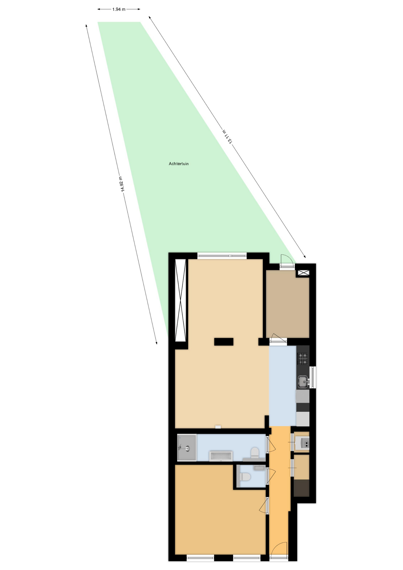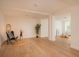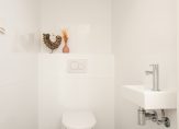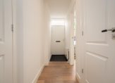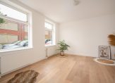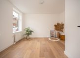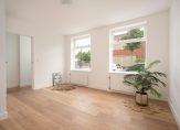 Eigen entree op de begane grond, gang met trapkast, aparte vaste kast voor de wasmachine en apart toilet met fraai tegelwerk en wandcloset. Vanuit de hal de stijlvolle woonkamer met lamelparketvloer en luxe open keuken voorzien van composiet werkblad, 4-pits gaskookplaat, combioven, vaatwasser, afzuigkap en koelkast. Aan de voorzijde de riante slaapkamer, aan de achterzijde nog een goed formaat slaapkamer met deur naar 13 meter diepe achtertuin die op de middag- en avondzon is gelegen. De luxe tussengelegen badkamer is voorzien van fraai tegelwerk, handdoekradiator, hangend toilet, badkamermeubel met wastafel en inloopdouche met glazen wand.