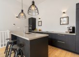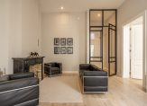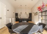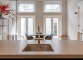 Entree van het appartementengebouw, indrukwekkende hal met monumentaal trappenhuis, schitterend houdsnijwerk en ornamenten. Entree van het appartement op de begane grond, hal met apart toilet voorzien van fraai tegelwerk, wandcloset en fonteintje. Vanuit de hal dubbele zwart stalen deuren naar de zitkamer met gigantische plafondhoogte van ca. 3,75 meter, haard met stenen schouw en woonkeuken voorzien van spectaculaire lichtinval, dubbele openslaande deuren naar terras, keuken voorzien van composiet werkblad, inductiekookplaat met geïntegreerde afzuiging, combimagnetron en koel-/vriescombinatie. Het spoeleiland is voorzien van composiet werkblad, mengkraan, bar en vaatwasser.