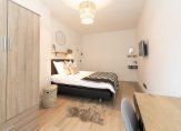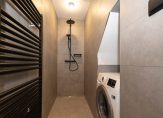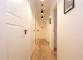 Open portiek, buitentrap naar 1e etage, entree appartement volledig voorzien van fraaie laminaatvloeren met brede delen, L- vormige gang, modern toilet met wandcloset, mechanische ventilatie en antracietkleurige wand- en vloertegels, vaste kast met uitgebreide elektrische installatie, moderne badkamer met inloopdouche met drain, regen- en handdouche, handdoek radiator, nis met opstelplaats wasmachine, antracietkleurige wand- en vloertegels.