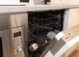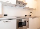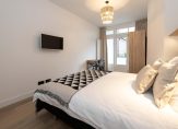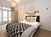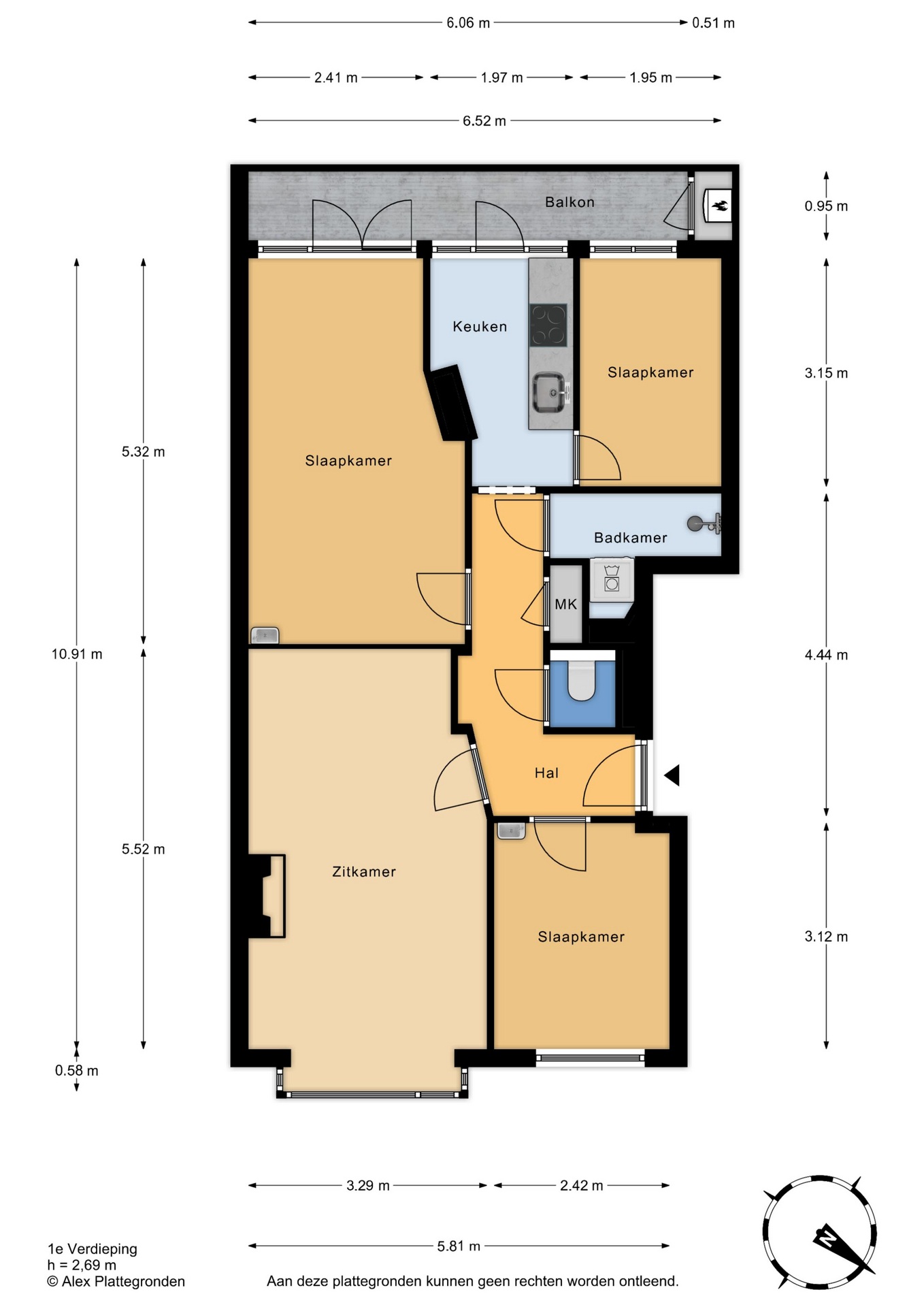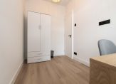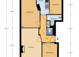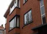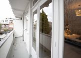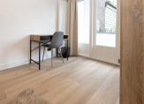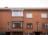 Moderne keuken met kunststof aanrecht, rvs spoelbak, koelkast met vriesvak, kookplaat, rvs combi magnetron, vaatwasser, rvs afzuigkap, en deur naar achterbalkon over de volle breedte met balkonkast met CV combiketel Intergas HRE, woonkamer met schouw en erker met vrij uitzicht over de straat, voorzijkamer, grote achterslaapkamer met openslaande deuren naar het balkon, achterzijkamer.
