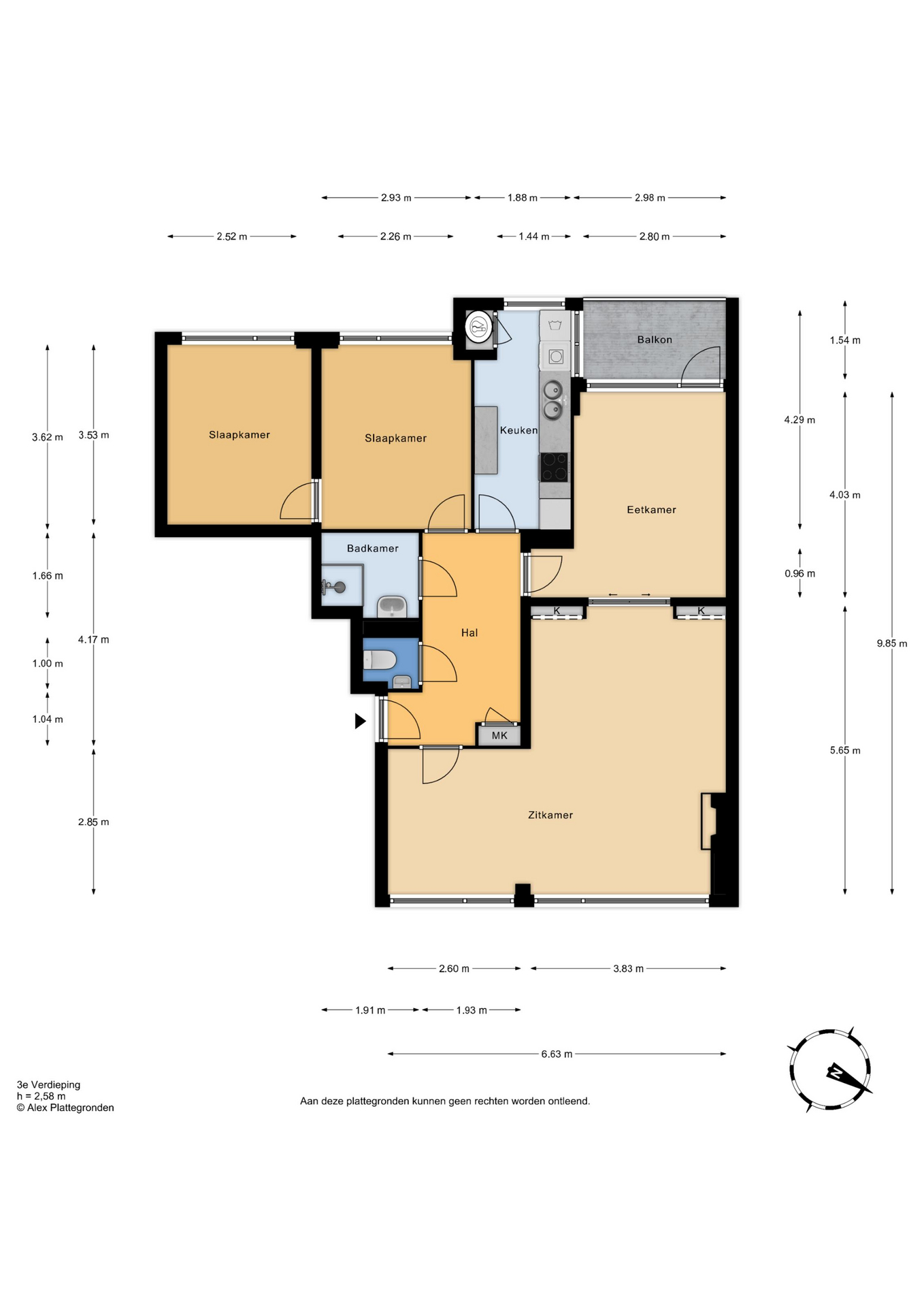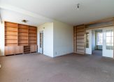 Centrale entree met brievenbussen- en bellentableau, trap of lift naar 3e etage, entree appartement, ruime hal met meterkast en toilet met fontein. Aan de voorzijde over de breedte van de woning een zeer ruime en lichte L-vormige woonkamer, de achtergelegen eetkamer is perfect geschikt om af te scheiden als een ruime 3e slaapkamer, deur naar zonnig achterbalkon, ruime eenvoudige keuken, aan de andere kant van de hal vindt men 2 ruime naast elkaar gelegen slaapkamers en een eenvoudige badkamer met douche en wastafel.