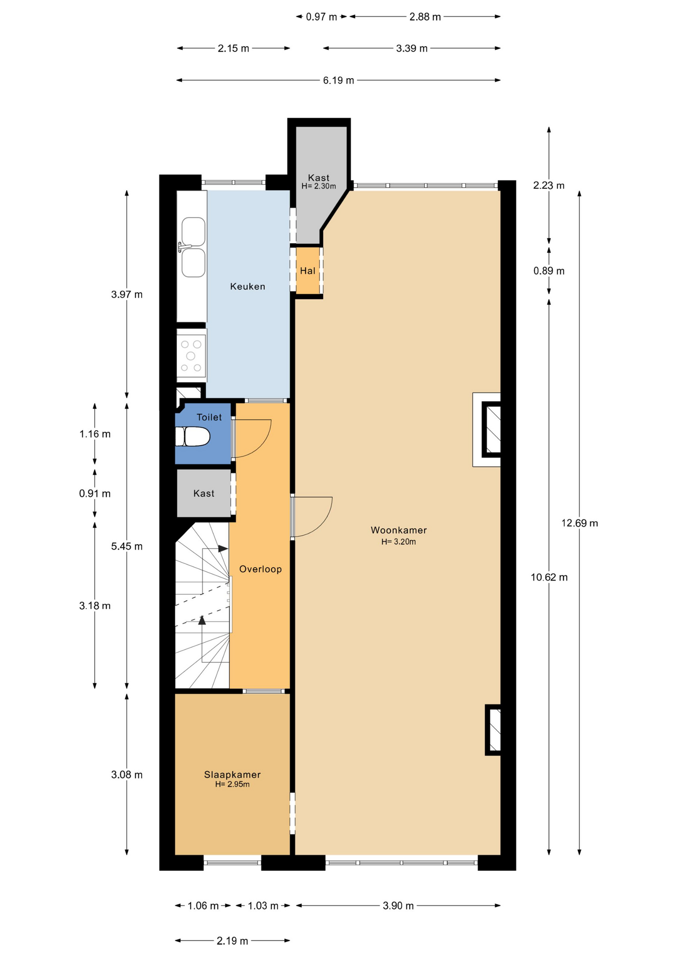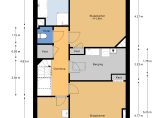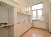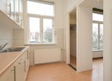 Entree op straatniveau, ruimte voor de trap met meterkast, trap naar de eerste etage, overloop met garderobe, zijkamer aan de voorzijde en apart toilet. Vanuit de overloop de karakteristieke kamers voormalig en suite met hoge plafonds, grote raampartij aan de voorzijde, vaste kast en gunstige lichtinval. Aan de achterzijde is ruime keuken gelegen die is voorzien van keurige kasten, 4-pits gaskookplaat en dubbele rvs spoelbak.