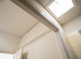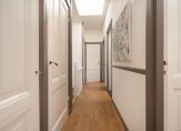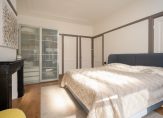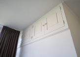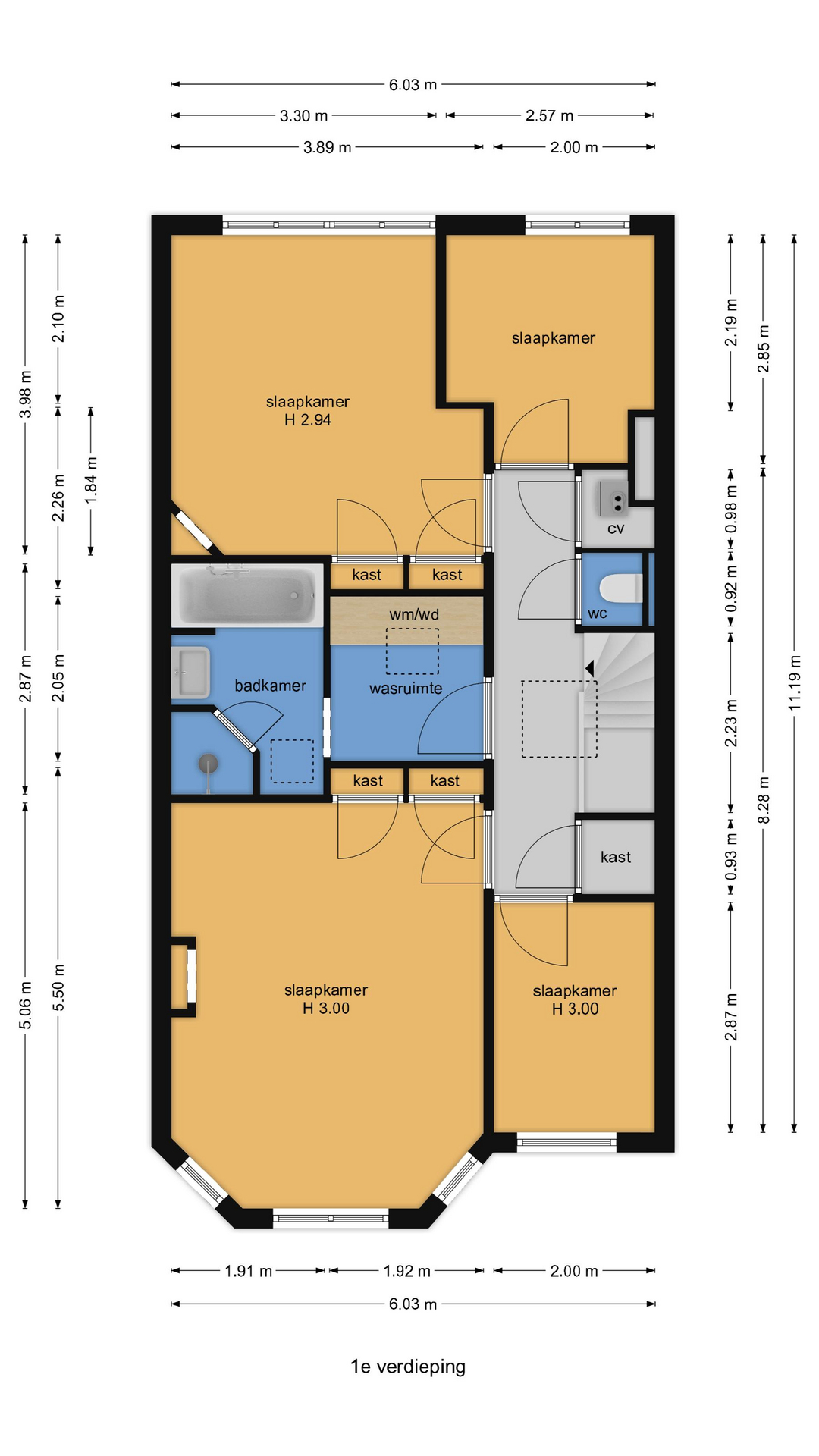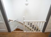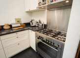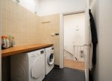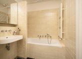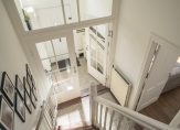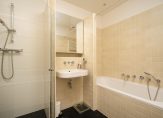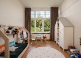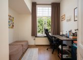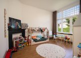 Trap naar 1e etage, zeer lichte overloop met dakraam, inbouwkasten en toilet met fonteintje, ruime ouderslaapkamer met schoorsteenmantel, erker en twee inbouwkasten, zijkamer, wasruimte met werkblad en aansluitingen voor wasmachine en -droger, bergruimte en dakraam, badkamer met ligbad, aparte douche, wastafel, vloerverwarming en dakraam, ruime achterslaapkamer met 2 inbouwkasten en bergruimte, zijkamer. Alle kamers voorzien van laminaatvloeren.