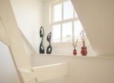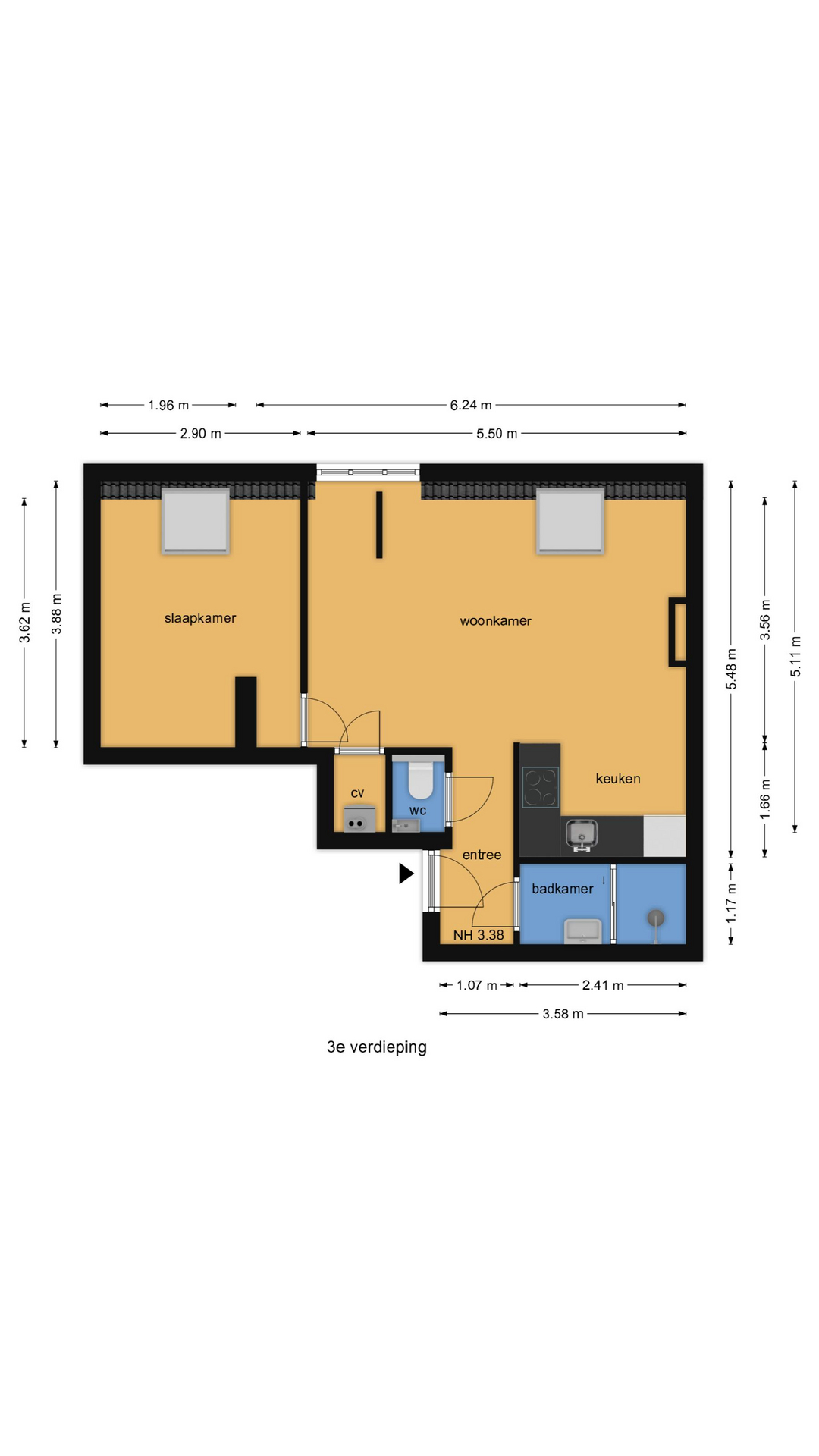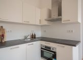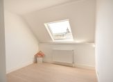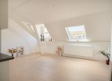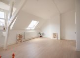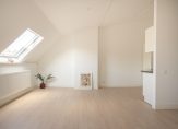 Entree van het voormalig herenhuis, trap naar de 3e etage, entree appartement, toilet met wandcloset, sfeervolle woonkamer met dakraam, dakkapel, technische ruimte met cv-ketel, kapconstructie in het zicht en luxe open keuken in hoekopstelling voorzien van inductiekookplaat, oven, koel-/vriescombinatie, afzuigkap en vaatwasser. Aan de voorzijde de ruime slaapkamer die eveneens is voorzien van dakraam. De tussengelegen badkamer beschikt over lichtgrijs tegelwerk, meubel met wastafel en inloopdouche met glazen wand.