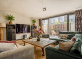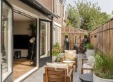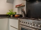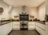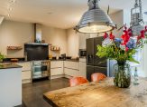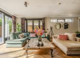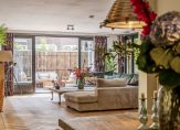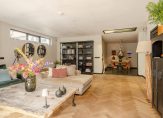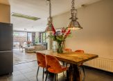 Vanuit de hal is de woonkeuken te bereiken die is voorzien van keukenblok in U-opstelling voorzien van composiet werkblad, 6-pits Boretti gasfornuis met brede oven, koel-/vriescombinatie, inbouwmagnetron en vaatwasser. Tussen de woonkeuken en de living is een lichtstraat aangebracht waardoor een zeer gunstige lichtinval is ontstaan. De woonkamer beschikt over een uitzonderlijke basismaat van totaal bijna 50 m² met grote raampartijen en openslaande deuren aan beiden zijden naar de hoektuin die op het zonnige zuidoosten is gelegen.