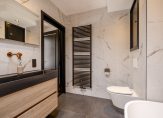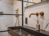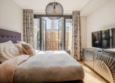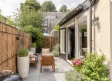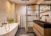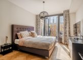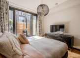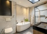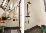 De hoofdslaapkamer is rustig gelegen aan de achterzijde, heeft openslaande deuren naar de tuin en een eigen badkamer voorzien van hoogwaardig tegelwerk, half vrijstaand ligbad, meubel met wastafel, wandcloset, daklicht en inloopdouche. Vanuit een tweede hal een trap naar de eerste etage waar de tweede slaapkamer is gesitueerd met eigen badkamer voorzien van douche, handdoekradiator en meubel met waskom.
