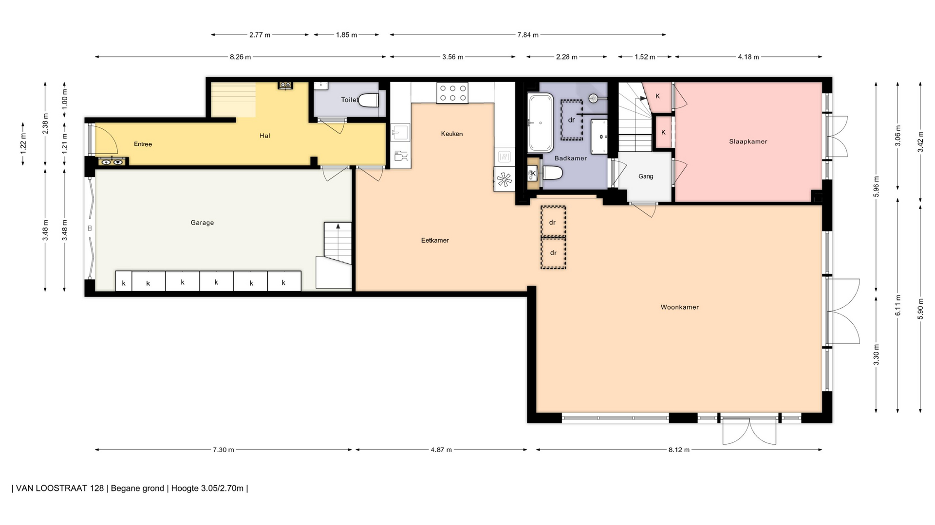 Entree van de woning middels oorspronkelijke voordeur of garagedeuren, ruime L-vormige hal met meterkast en toilet voorzien van fraai marmerlook tegelwerk, wandcloset en fonteintje. Aan de voorzijde van het gebouw de riante garage van ca. 7.30×3.48 momenteel door de huidige eigenaren in gebruik als woonruimte. Vanuit de garage een vaste trap naar de kelder die wordt gebruikt als opslag en wasruimte.