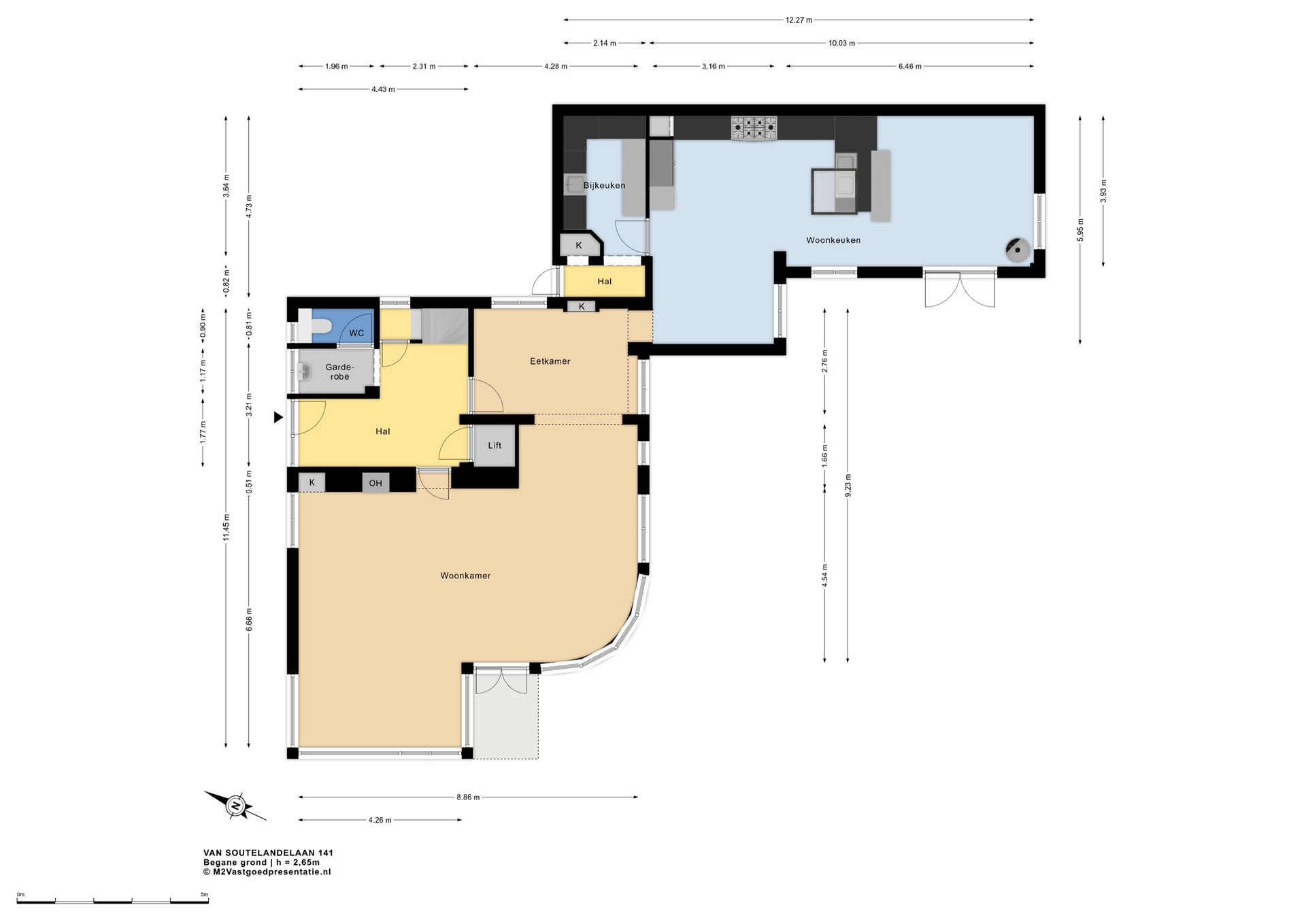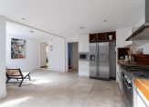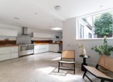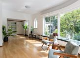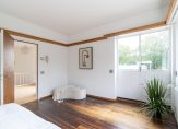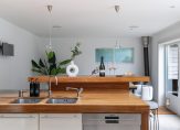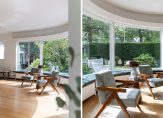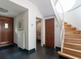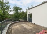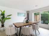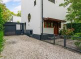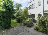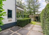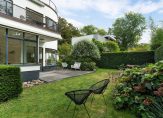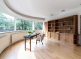 Vanuit de hal de woonkamer met spectaculaire lichtinval dankzij gunstige ligging en enorme gebogen raampartijen met uitzicht over de tuin, de eetkamer is rustig gelegen en tevens met de hal verbonden, de voormalige garage is getransformeerd tot woonkeuken voorzien van Zebrano-houten werkblad, Quooker, vaatwasser, breed fornuis met 6-pits gasfornuis en dubbele oven, inbouwmagnetron, Amerikaanse koel-/vriescombinatie en praktische bijkeuken. Ook vanuit de keuken zijn er openslaande deuren aanwezig om de riante tuin te bereiken.