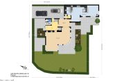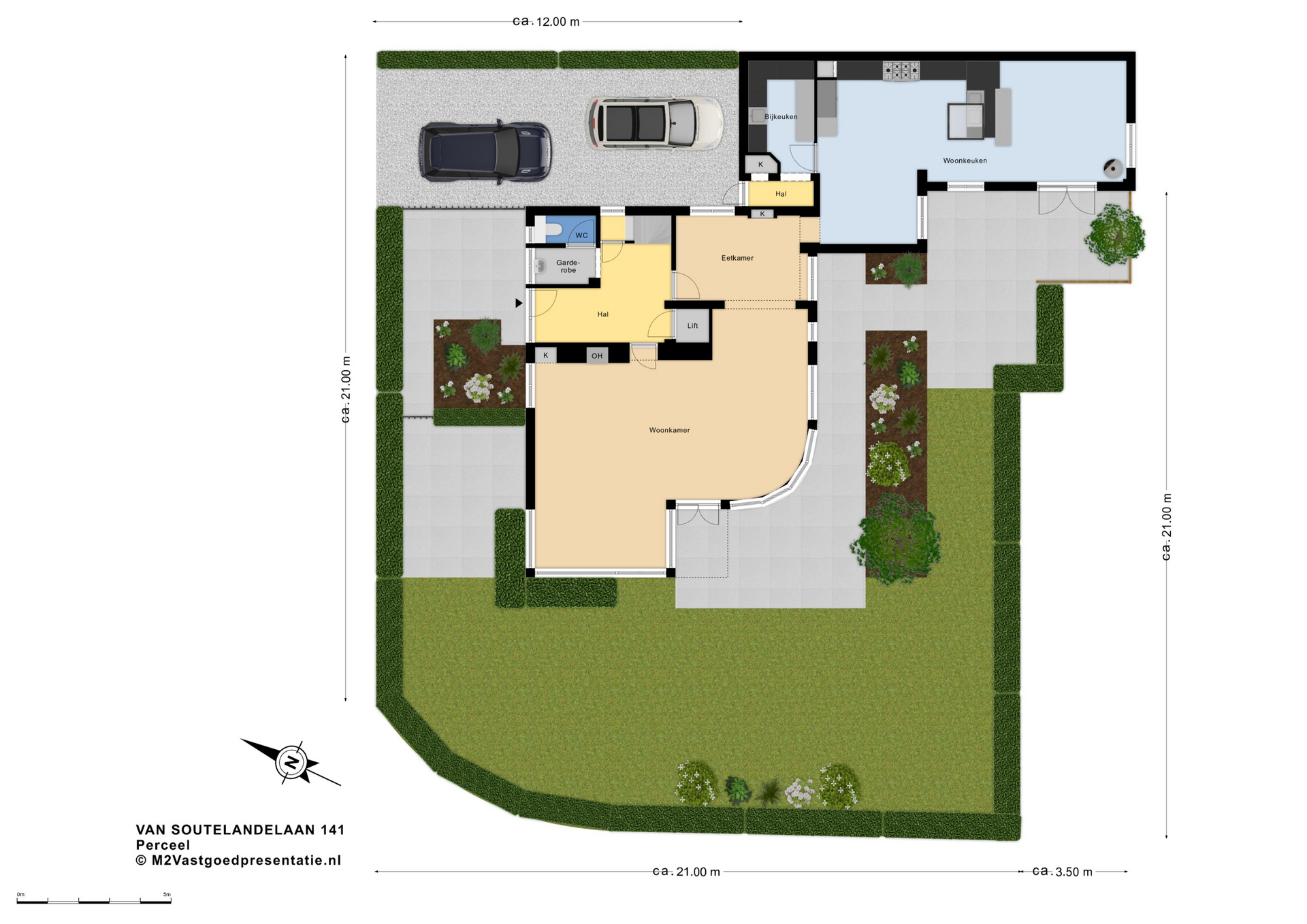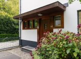 Oprit voor twee auto’s, tuin rondom met diverse terrassen en gazon, entree van de villa met garderobe, toilet en trap naar ca. 30 m² kelder voorzien van meterkast en opstelplaats voor de cv-ketel.