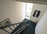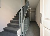 Buitentrap naar corridor, centrale entree met brievenbussen en bellentableau van een laagbouw appartementencomplex met trappenhuis naar de 2e etage.