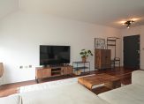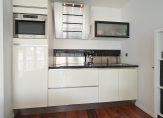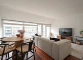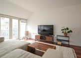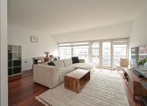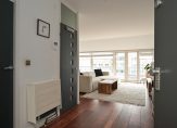 Entree appartement die volledig voorzien is van fraaie houten lamelvloeren met brede delen, ruime centrale hal in open verbinding met zeer lichte living met luxe open keuken met zwart natuurstenen aanrecht, rvs spoelbak, 4-pits inductie kookplaat, design rvs afzuigkap, vaatwasser, koelkast met vriesvak en rvs combioven voorts openslaande deuren naar heerlijk zonnig terras ca. 5.60×1.40 op Zuidoost met vrij uitzicht over Scheveningen!