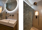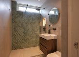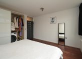 Vanuit centrale hal meterkast met elektra-, gas- en watermeter alsmede luxe moderne badkamer met inloopdouche met regen- en handdouche, drain en glazen wand, vaste wastafel met meubel en verlichte spiegel, wandcloset, vloerverwarming, inbouwverlichting, grote wand- en vloertegels en kast met CV-combiketel Vaillant, ruime achter slaapkamer met ingebouwde garderobekast met tevens de opstelling voor de wasmachine.