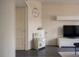 A shared entrance leads to the private entrance of the apartment on the second floor. The hallway features a modern fuse box, a separate WC with a washbasin, and a deep cloakroom/storage cupboard. The kitchen is fitted with a fridge-freezer, five-burner gas hob, microwave, and oven, as well as a cupboard housing the central heating boiler. A door opens onto the balcony, which enjoys unobstructed views and a useful storage cupboard.