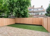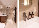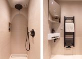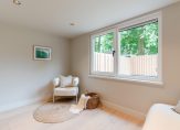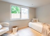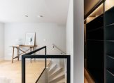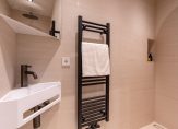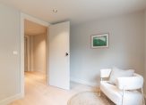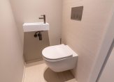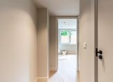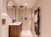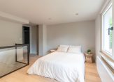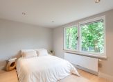 Aan de achterzijde een slaapkamer met uitzicht over de tuin en de badkamer die eveneens is voorzien van hoogwaardig tegelwerk, wandtoilet, inloopdouche met glazen wand en meubel met waskom. Op de eerste etage nog een goed formaat slaapkamer met inloopkast en uitzicht over de tuin.