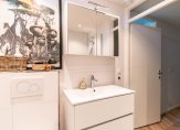 Ascending the contemporary open staircase, you’ll find the first floor. The generous landing includes a modern guest WC with a washbasin. A glass door leads into the bright through-lounge with an open-plan kitchen. This state-of-the-art kitchen (installed in 2023) features a natural stone worktop, an induction hob, an integrated dishwasher, a refrigerator, a freestanding freezer, an extractor fan, and a combination oven-microwave. The lounge provides access to a rear-facing balcony, perfectly positioned to enjoy the evening sun. A charming fireplace and an elegant herringbone-patterned PVC floor, laid throughout the property (excluding the bathroom and WC), complete the space.